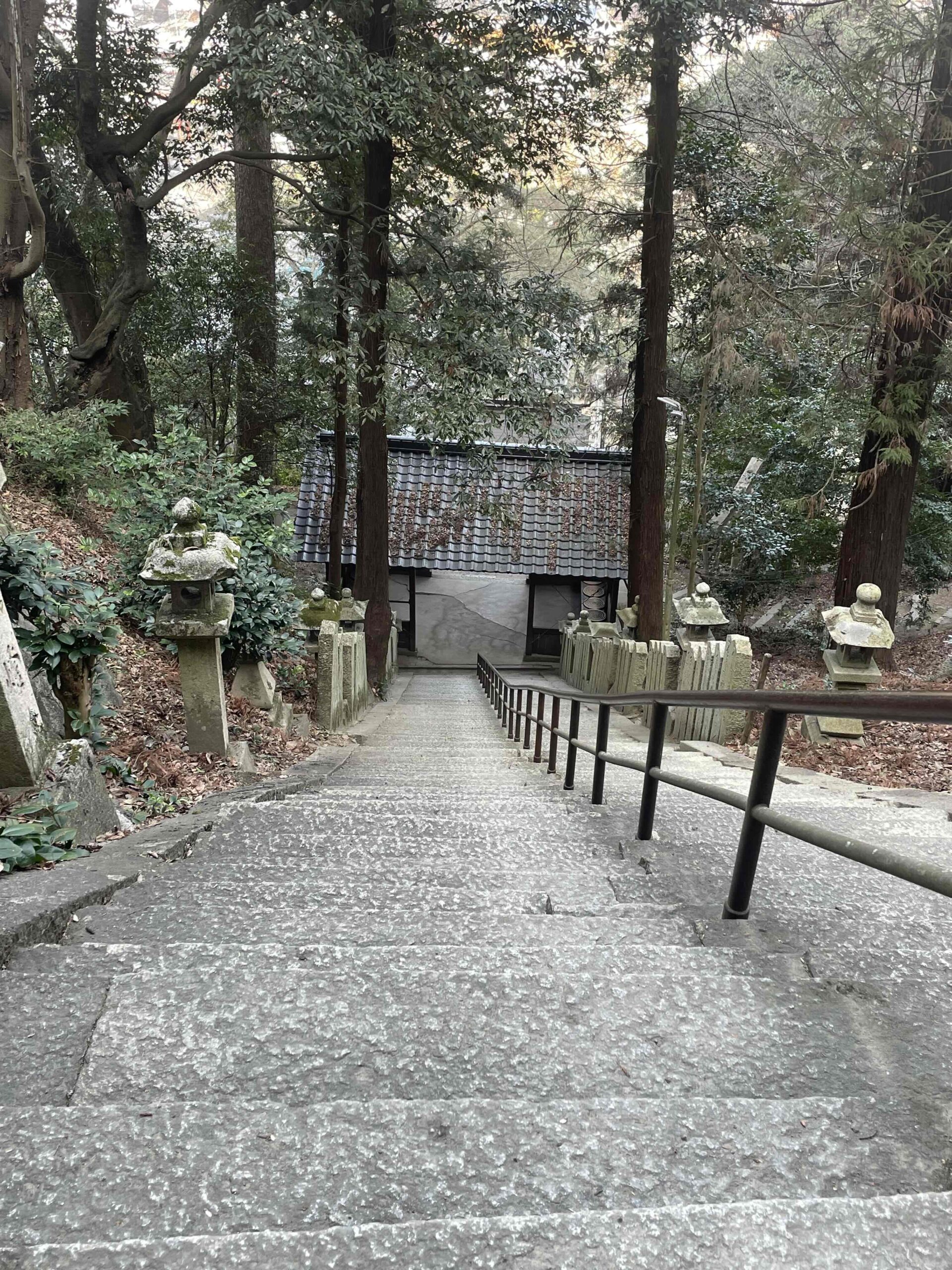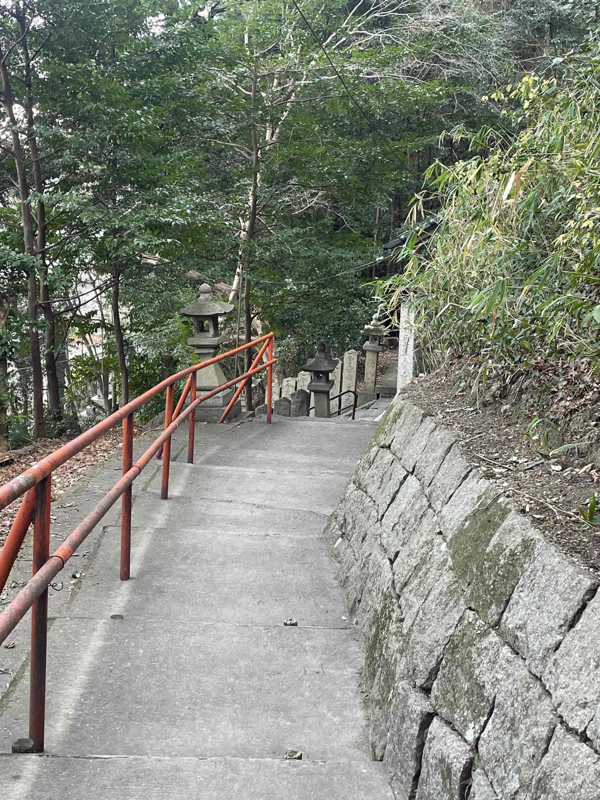 よそ見厳禁の急な階段で、高さや幅、傾きも一段一段違ううえに、頼みの手すりが低い。