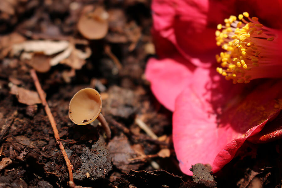散った椿の花の組織を分解し栄養を得て生活しているきのこで、ツバキの下にしか発生しません。