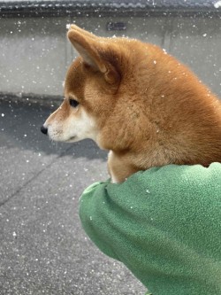 入り口を見つめ続ける犬一匹。粉雪の中、寂し気なたまです。