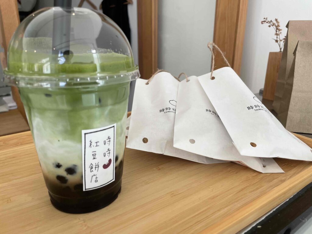 かわいい袋に包まれたたい焼きと、点てたばかりの抹茶がそそがれたタピオカドリンク。