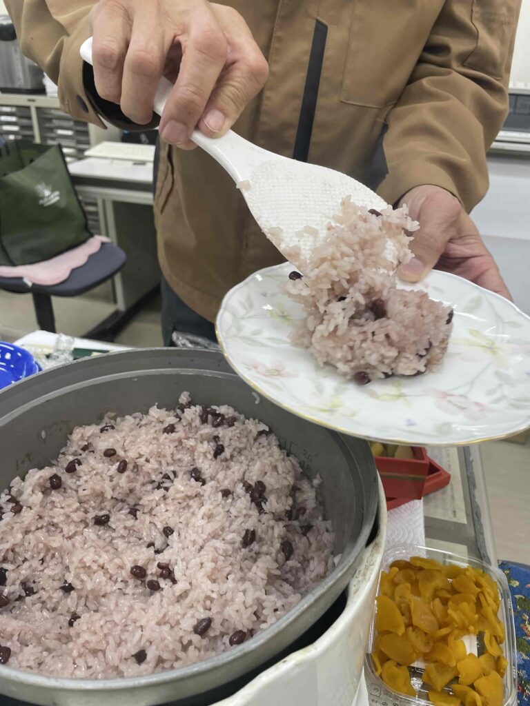 赤飯と炊き込みご飯を炊き、健診が終わった人から順番にうどんが配られます。