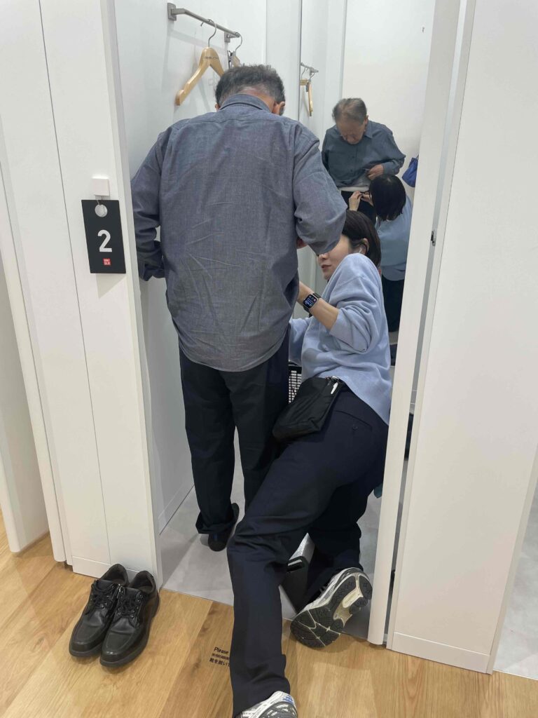 ステテコ姿を恥ずかしいと思わない世代なのか、扉を開け放して試着しようとします