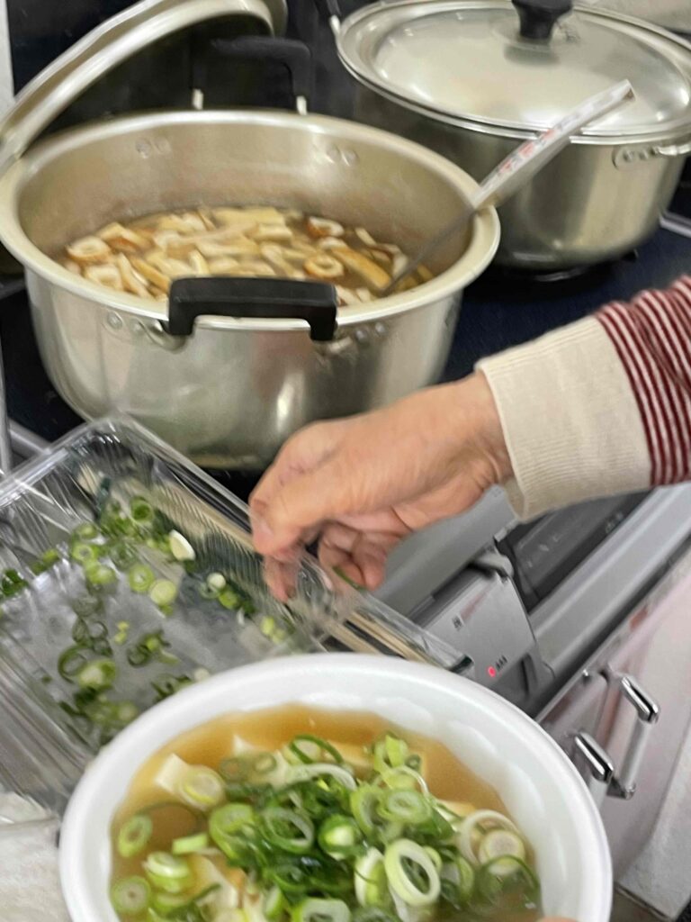 炊き出し用の鍋で、お汁を作り始める社長のお母さん。