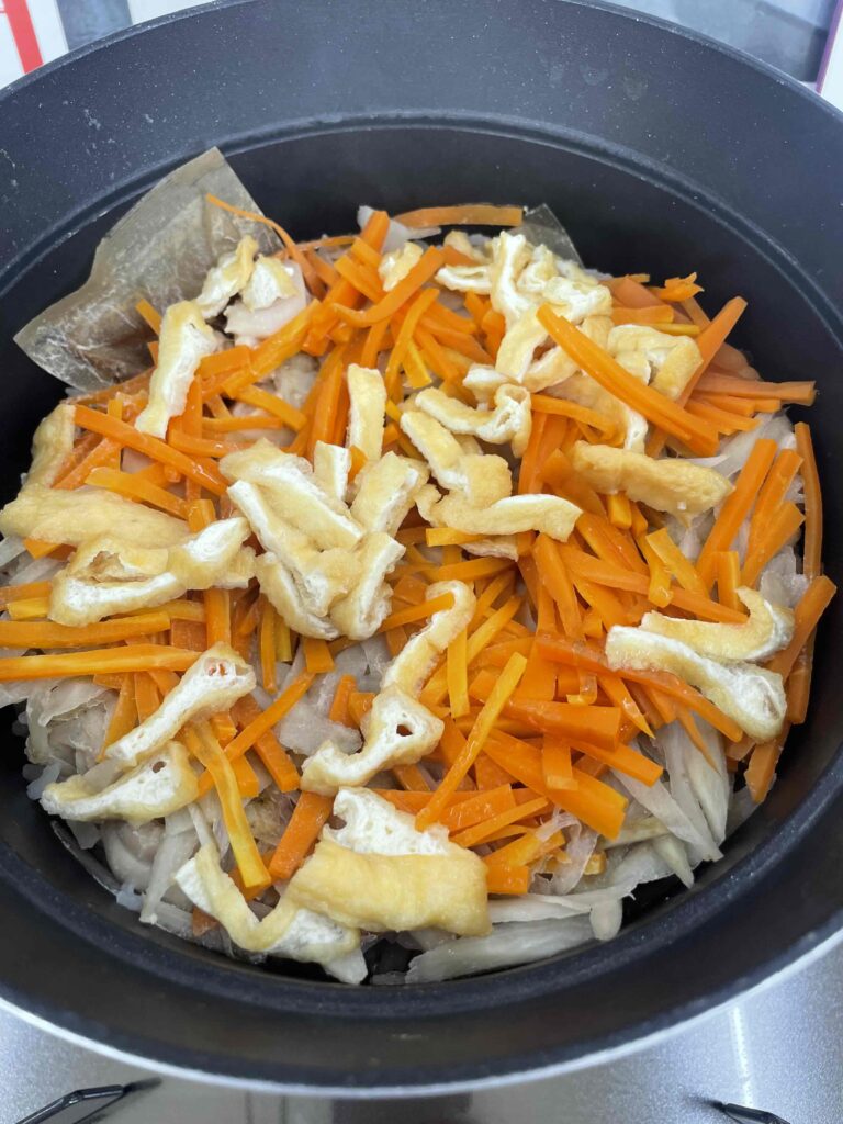 鍋の底にはおこげが出来て、お店で食べるかやくご飯が、自宅で簡単に出来上がります。