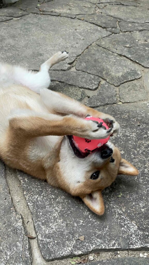 たまの分と2個買ったのに、独り占めし、1人楽しそうにブーブー言わせては、庭を転がり回っています。大人げないやっちゃ。